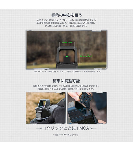 ・3MOAのドットはきれいで見つけやすく、迅速かつ正確な射撃をサポート。