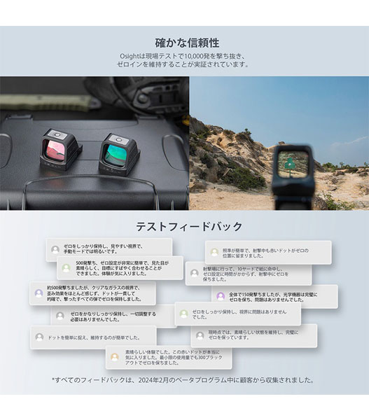 ・実銃10,000発のテスト中でもゼロインがキープでき、照準精度をしっかりと確保。