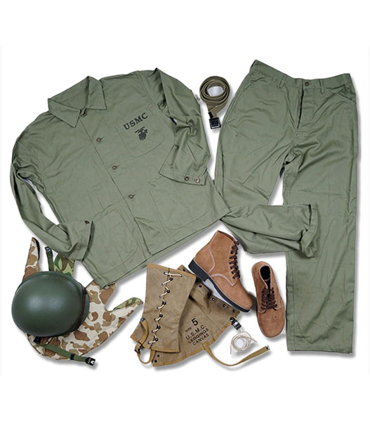 NB WWII US ARMY USMC HBT UNIFORM AND M1 HELMET WITH COVER USMC LEGGINGS AND BOOT BELT